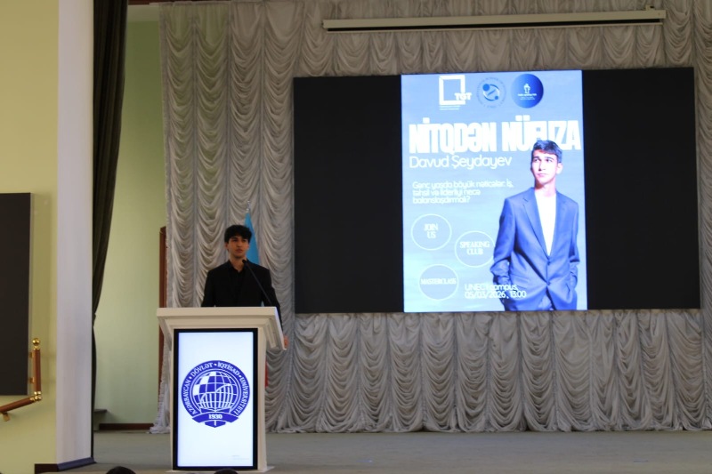 ISE Public Speaking Club-un prezidenti Davud Şeydayev təqdimatla çıxış edərək nitqin insanın şəxsi brendinin formalaşmasında və uğurlu karyera yolunda oynadığı roldan bəhs edib. O, effektiv ünsiyyətin əsas prinsipləri, auditoriya qarşısında inamlı çıxış, fikirlərin düzgün strukturlaşdırılması, eləcə də bədən dili və səs tonunun təsirli istifadəsi kimi vacib məqamlara toxunub.