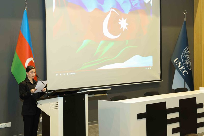 Tədbirdə UNEC-in müəllim-tələbə heyəti ilə yanaşı, universitetin Vətən müharibəsində şəhid olmuş məzunları - Məzdək Eyvazlı və Əbil Cəbizadənin valideynləri də iştirak ediblər. Tədbirin açılışında Dövlət himni səsləndirilib, şəhidlərin əziz xatirəsi ehtiramla yad edilib və onların həyat yolundan bəhs edən videoçarx nümayiş olunub.