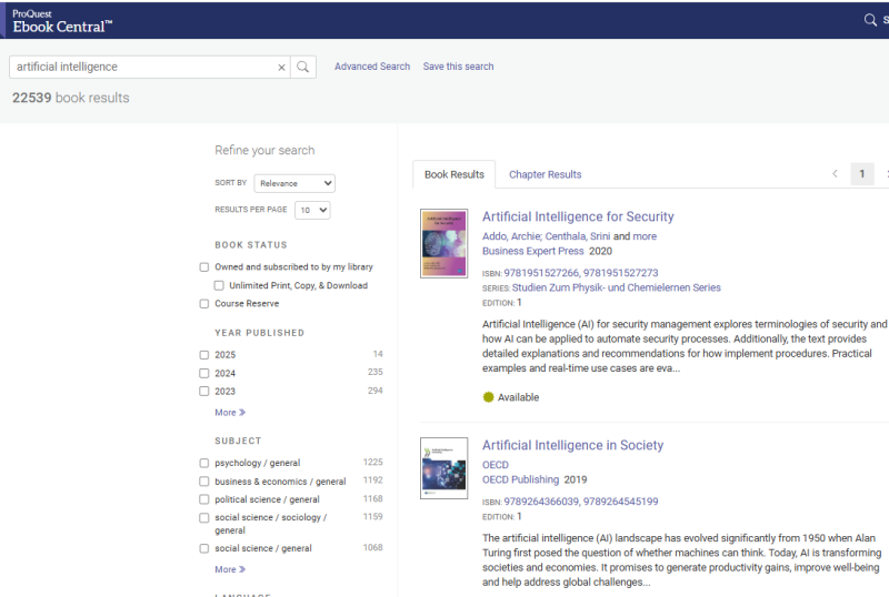 UNEC-in abunə olduğu ProQuestEbookCentral (https://ebookcentral.proquest.com/lib/azerbastat/home.action) bazası üzrə Süni İntellekt (Sİ) mövzusunda araşdırma apardıq. Qeyd edim ki, bazada əsasən dünyanın bir çox nəşriyyatlarında çap edilmiş müxtəlif sahələr üzrə e-kitablar təqdim edilir. Bazada Sİ üzrə 22539 kitab var. Son on illik dövr üzrə apardığımız təhlilin nəticəsinə əsasən bazada 7015 e-kitab aşkar edilib ki, bu kitabların da 1500-ə qədəri iqtisadiyyatın müxtəlif sahələrini əhatə edir. Mövzu üzrə kitabların əksəriyyəti- 6938-i ingilis dilində, 22-si fransız, 21-i alman, 20-si ispan dilində, qalan qismi isə tək-tək olmaqla müxtəlif dillərdədir.