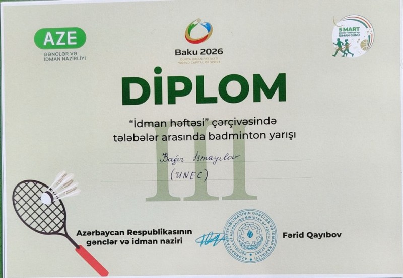12 universitetdən 38 idmançının qələbə uğrunda mübarizə apardığı badminton yarışında UNEC Biznes Məktəbinin tələbəsi Asəf Allahverdiyev I yeri, Rəqəmsal İqtisadiyyat fakültəsinin tələbəsi Bağır İsmayılov isə III-yeri qazanıb.