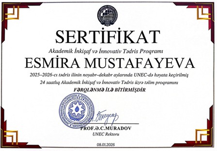 2026-cı ildə Akademik İnkişaf və İnnovativ Tədris üzrə Təlim proqramını müvəffəqiyyətlə bitirmiş və fərqlənmə sertifikatına layiq görülmüşdür.