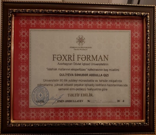 UNEC-in 95 illik yubileyi münasibətilə yüksək ixtisaslı mütəxəssislərin hazırlanmasında göstərdiyi xidmətlərinə görə Azərbaycan Dövlət İqtisad Universitetinin Fəxri Fərmanı ilə təltif olunub.
