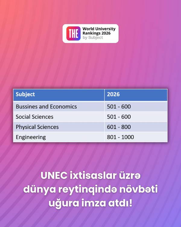 According to the results of the World University Rankings by Subject released by Times Higher Education (THE), Azerbaijan State University of Economics (UNEC) has achieved another significant success in global subject rankings.
