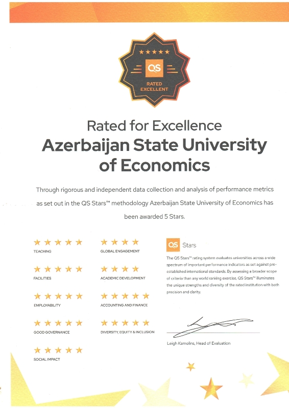 The QS Stars 5-Star Certificate was formally conferred on 25 November at an official ceremony held in Tashkent, Uzbekistan, hosted by the University of Central Asia and supported by QS. The certificate was presented to UNEC’s representative, Dr. Leyla Nazirzada, Head of the Internship Organization Department, by Mr. Nunzio Quacquarelli, Founder and President of QS.