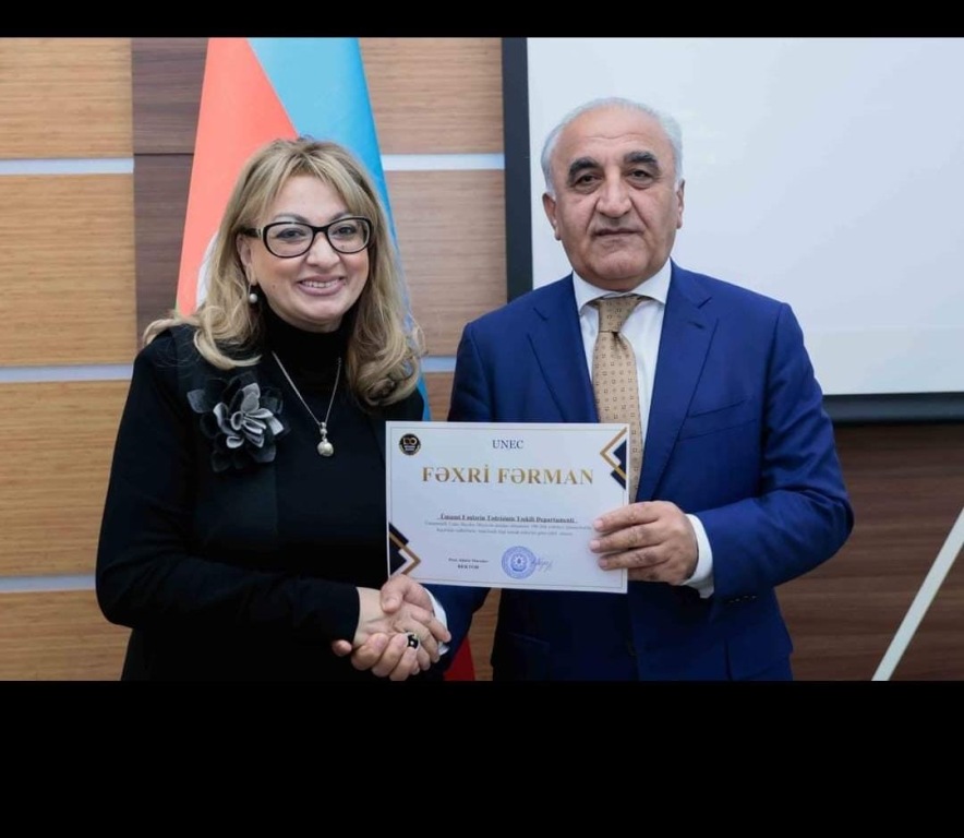 Azərbaycan Respublikası Prezidentinin 24 sentyabr 2020-ci il Sərəncamına əsasən Azərbaycan Dövlət İqtisad Universitetinin 90 illiyi münasibətilə və Azərbaycanda təhsilin inkişafındakı xidmətlərinə görə “Əməkdar müəllim”  Fəxri adına layiq görülmüşdür.