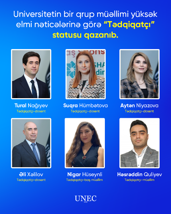 Группа преподавателей университета за высокие научные результаты получила звание «Исследователь». Сугре Гумбатовой, Туралу Нагиеву, Айтен Ниязовой и Али Халилову присвоено звание «Исследователь-доцент», Нигяр Гусейнли звание «Исследователь-старший преподаватель», Хасраддину Гулиеву звание «Исследователь-преподаватель».